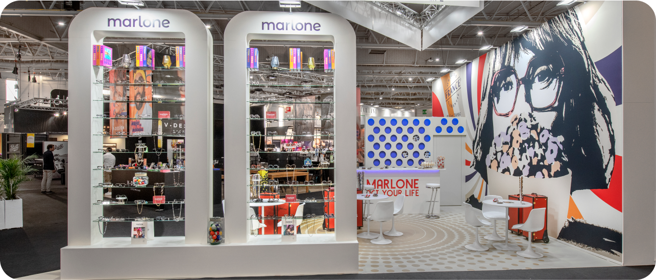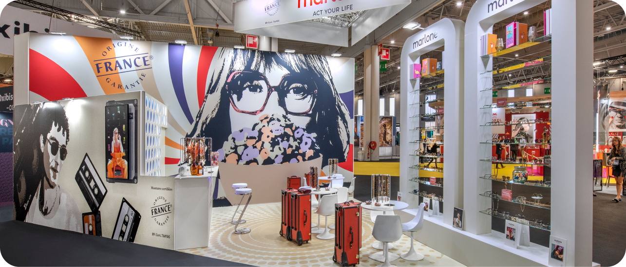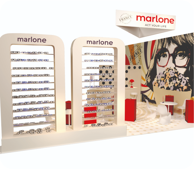 Pour sa participation au salon international de la filière optique – lunetterie, la marque de montures optiques Marlone nous a confié la création d’un stand hautement graphique, structuré autour d’une fresque pop aux accents seventies. Notre agence a conçu une sorte de plage urbaine mettant à l’honneur l’« Origine France Garantie »: bar à lunettes, mur imprimé façon street-art, lettrage néon personnalisé, PAO intégrale… La signalétique suspendue respecte les contraintes de hauteur du salon (4 m). Un stand qui reflète l’esprit libre et design de Marlone.