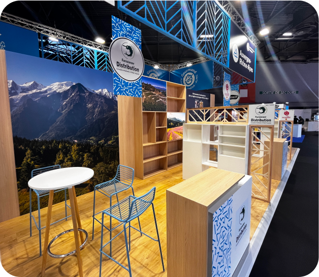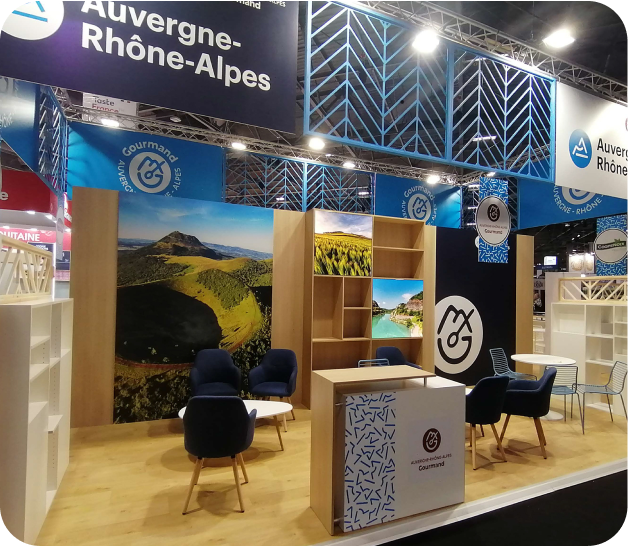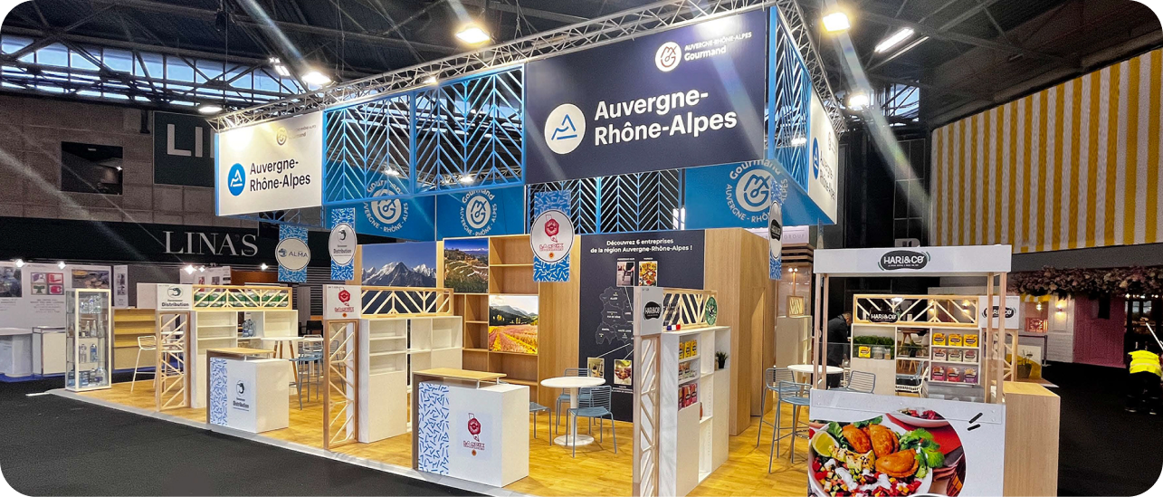 Bois clair, métal blanc ajouré, plancher, mobilier haut de gamme… Nous avons créé à l’occasion du Salon International de l’Alimentation un stand institutionnel élégant qui incarne l’identité forte de la région Auvergne-Rhône-Alpes. L’espace, pensé comme un marché ouvert, met en valeur une dizaine d’exposants grâce à une scénographie fluide et des séparations ajourées. La structure suspendue assure une visibilité à longue distance, renforcée par une signalétique soignée et des visuels immersifs valorisant le territoire. Le mobilier uniforme et fonctionnel crée une cohérence d’ensemble tout en respectant les besoins individuels. L’éclairage calibré sublime les produits exposés. Une réserve technique est intégrée pour optimiser la logistique. Tous les impératifs du cahier des charges ont été respectés : délais, propreté, modularité et maintenance.