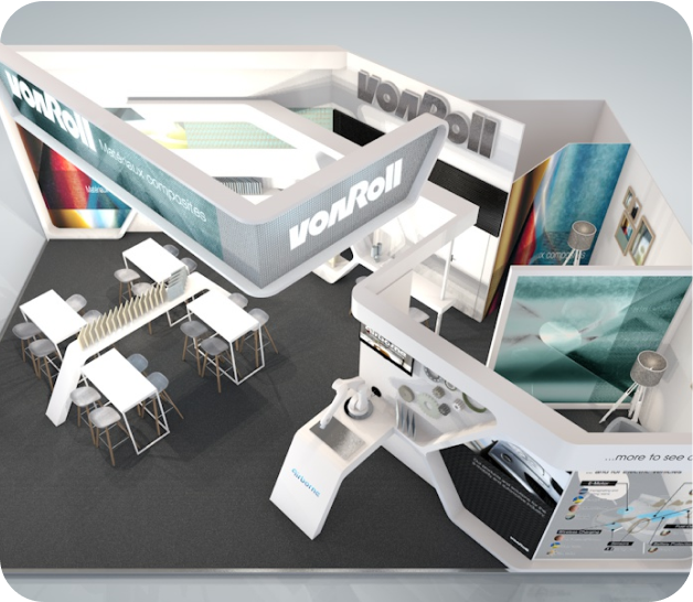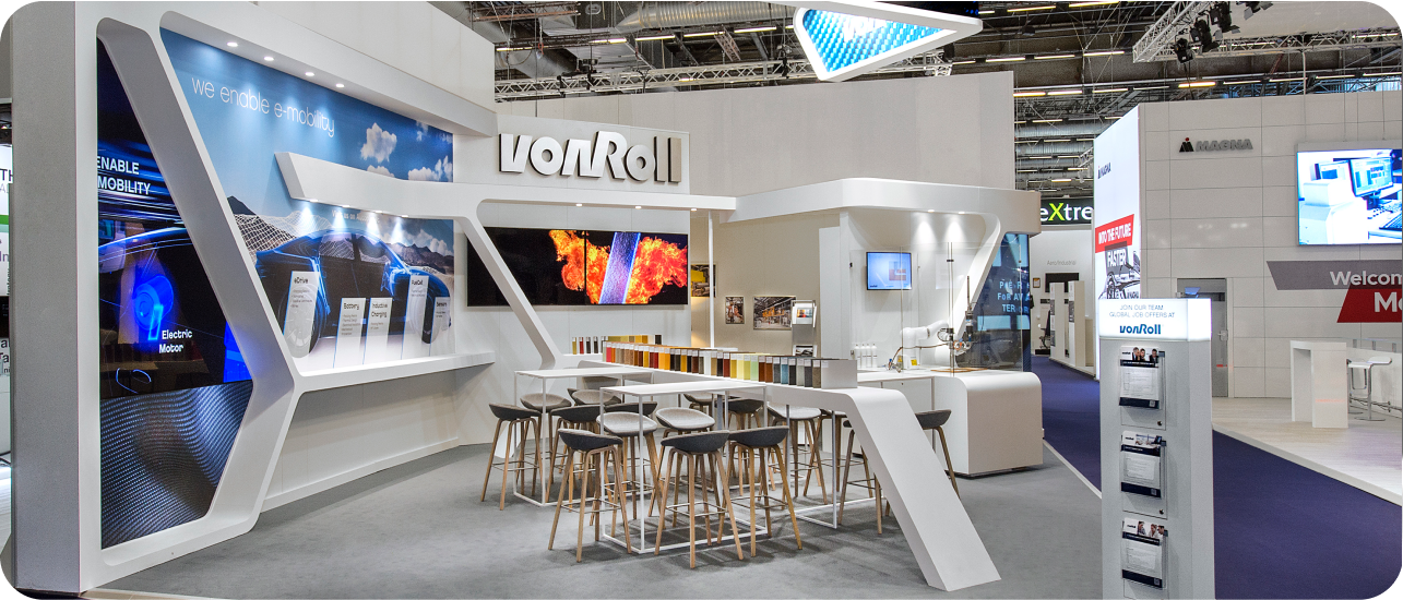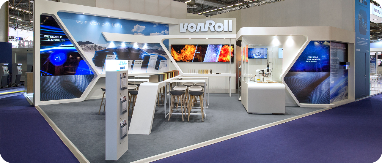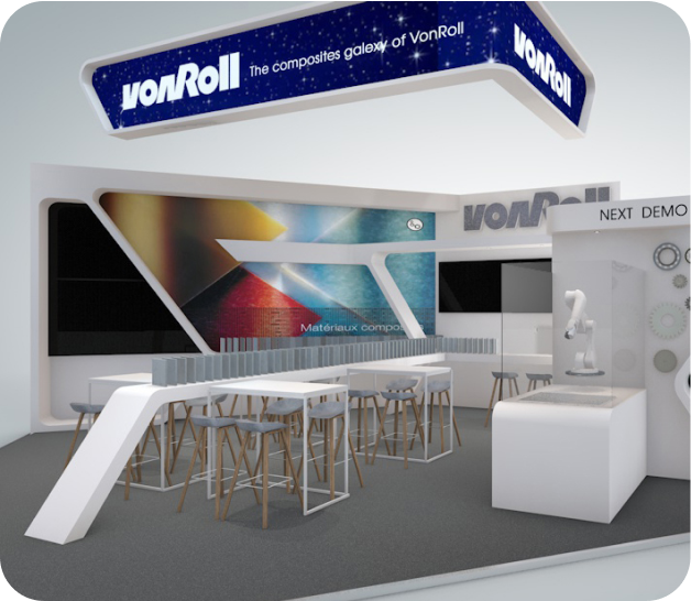 Von Roll / Elantas nous a confié la mission de concevoir un stand incarnant son positionnement de leader technologique dans les matériaux composites, à l’occasion de sa transformation en fournisseur de solutions globales pour les secteurs de l’e-mobilité et de l’aéronautique. Nous avons alors imaginé un espace au design contemporain, structuré autour de zones thématiques clairement identifiées, intégrant des démonstrateurs technologiques clés comme le robot « core filler ». L’esthétique épurée, les jeux de transparence grâce aux surfaces vitrées, et les éléments lumineux traduisent parfaitement l’innovation de la marque.